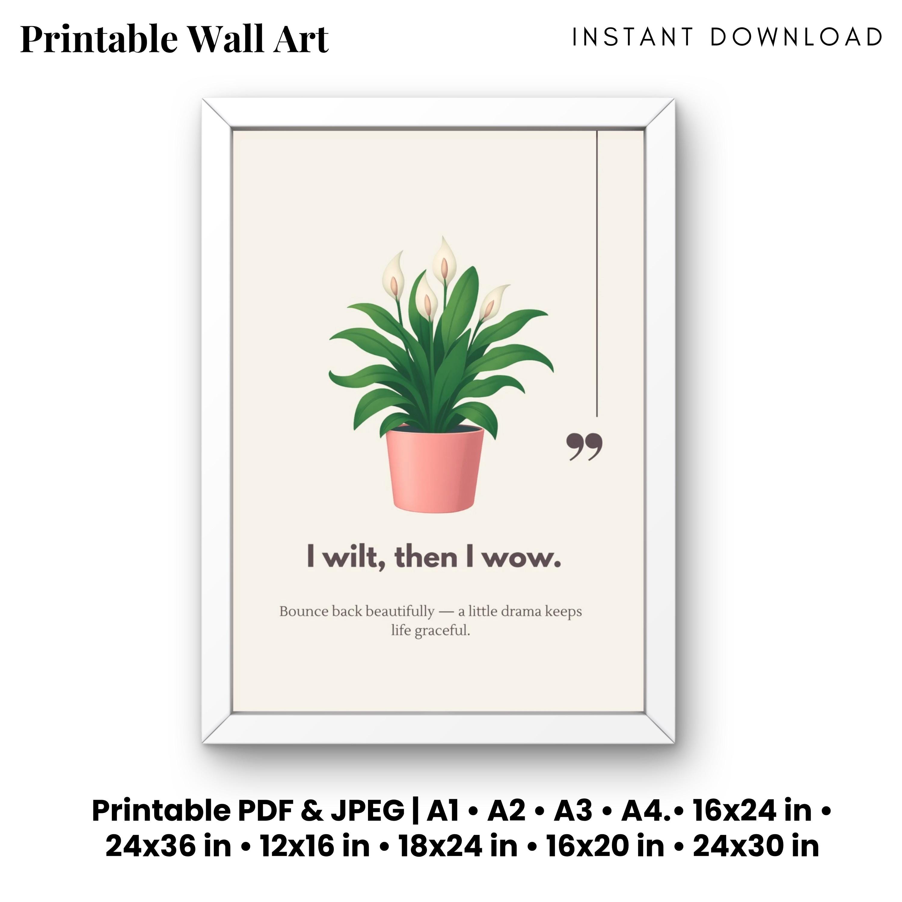 Embrace the glow-up energy of the iconic Peace Lily with this uplifting printable wall art. Known for drooping dramatically and then bouncing back even brighter, the Peace Lily becomes the perfect symbol for resilience, rest, and stunning comebacks.
